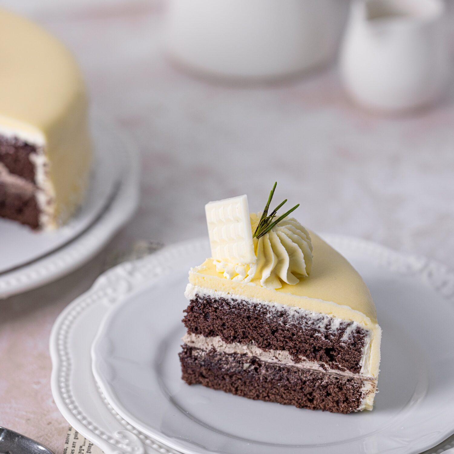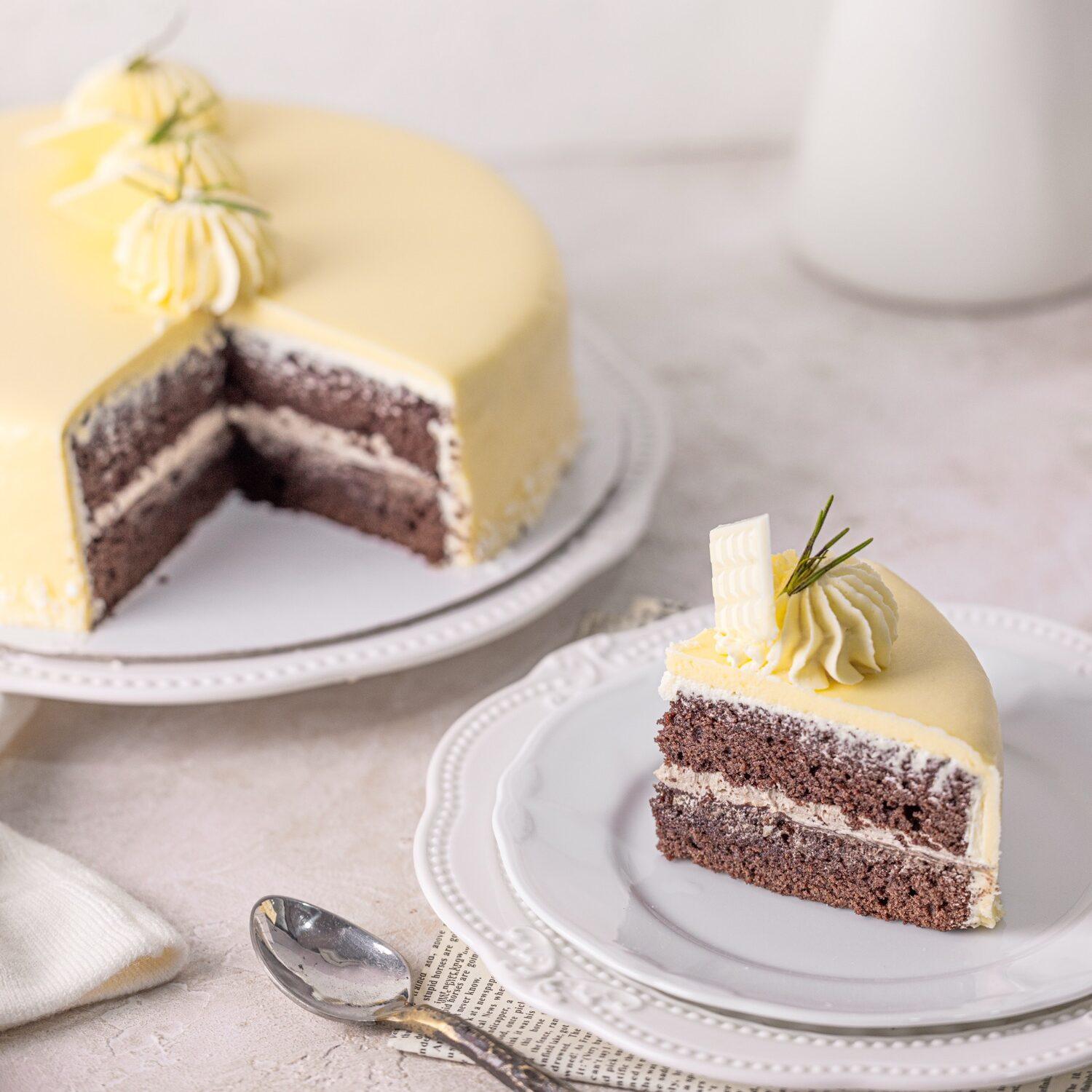 A special fudge chocolate cake base, coated with buttercream