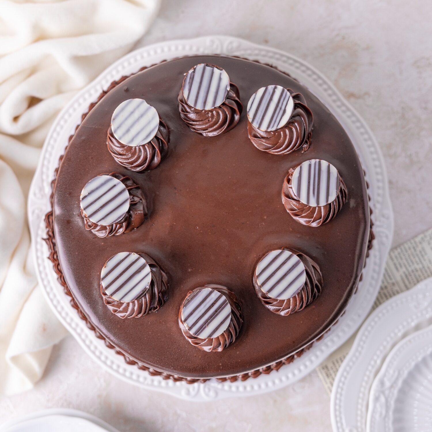 Arich, two-layered chocolate cake, sandwiched with dark chocolate, cashew nuts, and fresh cream, with velvety fudge and topped with chocolate ganache.
