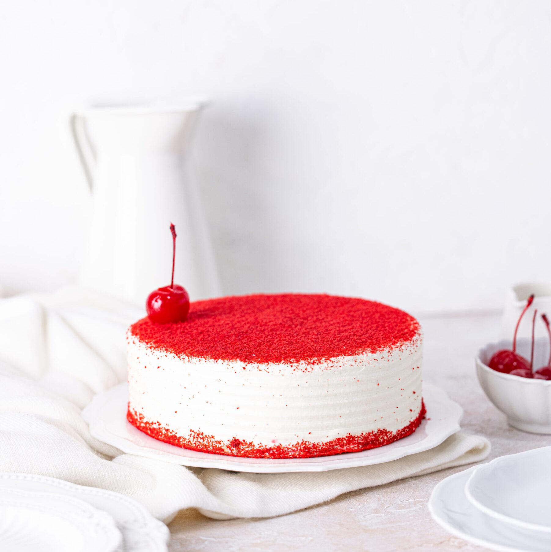 Red velvet cake, featuring a soft, rich base of red velvet, perfectly sandwiched with layers of cream cheese frosting.